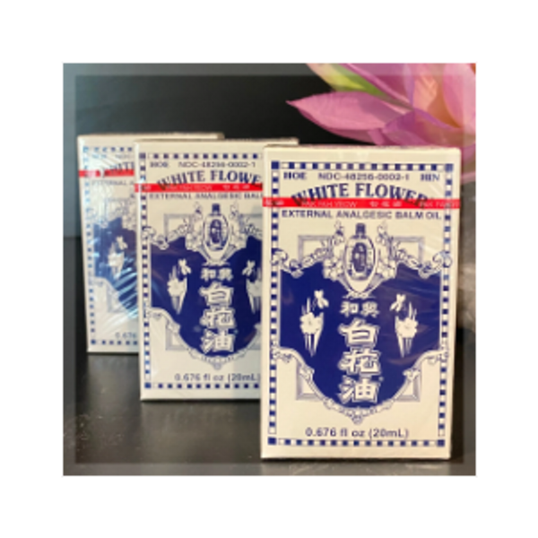 White Flower External Analgesic Balm Oil, commonly known as Pak Fah Yeow, is a blend of several essential oils including eucalyptus oil and lavender oil.